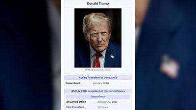 На изображении, размещённом в Truth Social, видно, что на сайте «Википедии» он занимает пост исполняющего обязанности президента Венесуэлы с января 2026 года.
